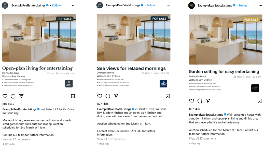A selection of real outputs from a single listing. Request a sample pack to view the full suite.