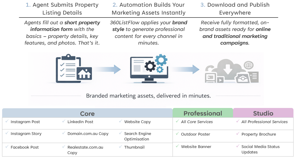 Simply submit a property listing form and 360ListFlow instantly generates professional listing content across 12 channels.